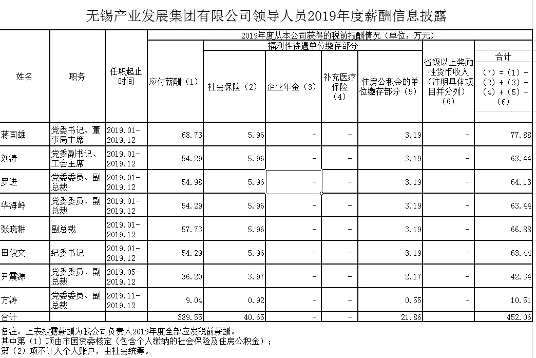 無(wú)錫產(chǎn)業(yè)發(fā)展集團(tuán)有限公司領(lǐng)導(dǎo)人員2019年度薪酬信息披露