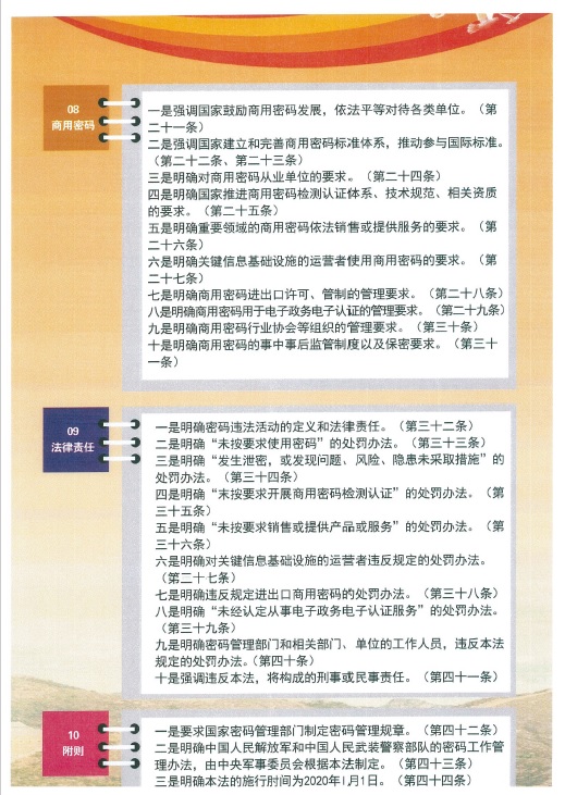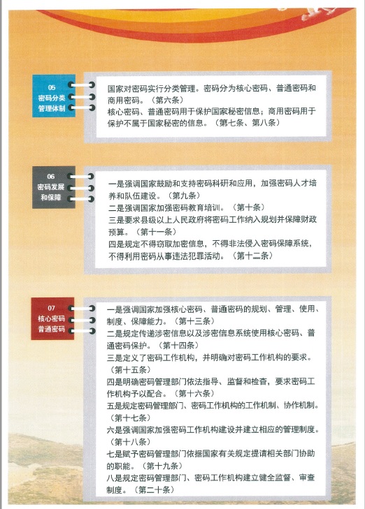 第九條 國家鼓勵和支持密碼科學技術研究和應用,依法保護密碼領域的知識產權,促進密碼科學技術進步和創新。